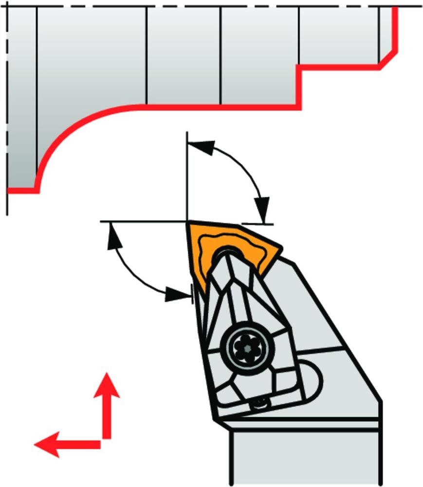 Dreh-Trägerwerkzeug doppelt geklemmt zum spannen von 80° Trigonal negative Wendeschneidplatten mit einem Innenkreisdurchmesser von 9.525mm · 4.76mm Dick (ISO Bezeichnung WN.. 0604.. ) · rechte Ausführung zum 95° Stirn-und Längsdrehen mit abgesetzem Schaft · 25mm Werkzeughöhe x 25mm Breite x 150mm Länge für Kegeldrehen · Stirndrehen mit und ohne Schulter und Längsdrehen mit und ohne Schulter