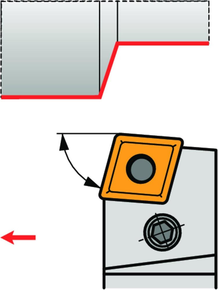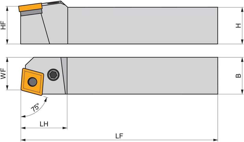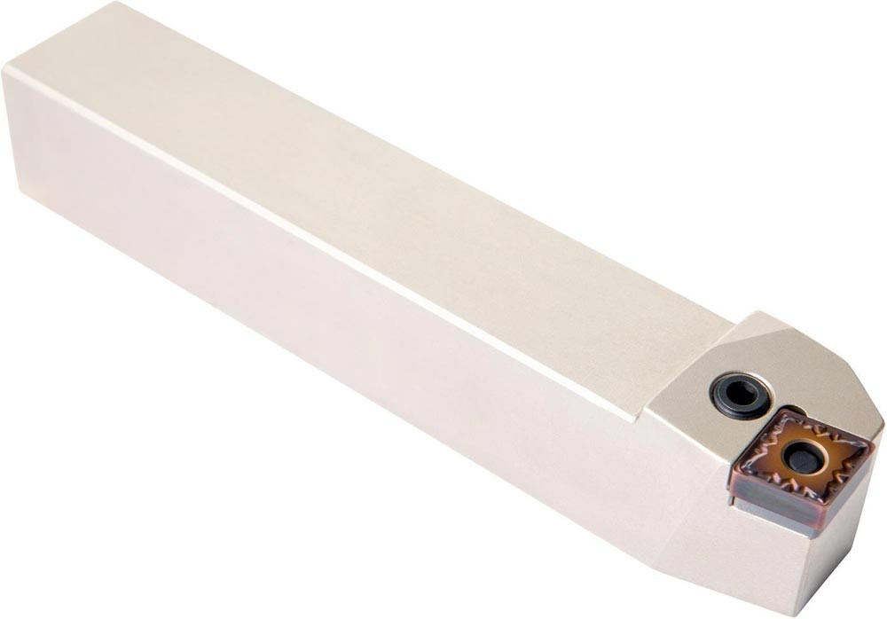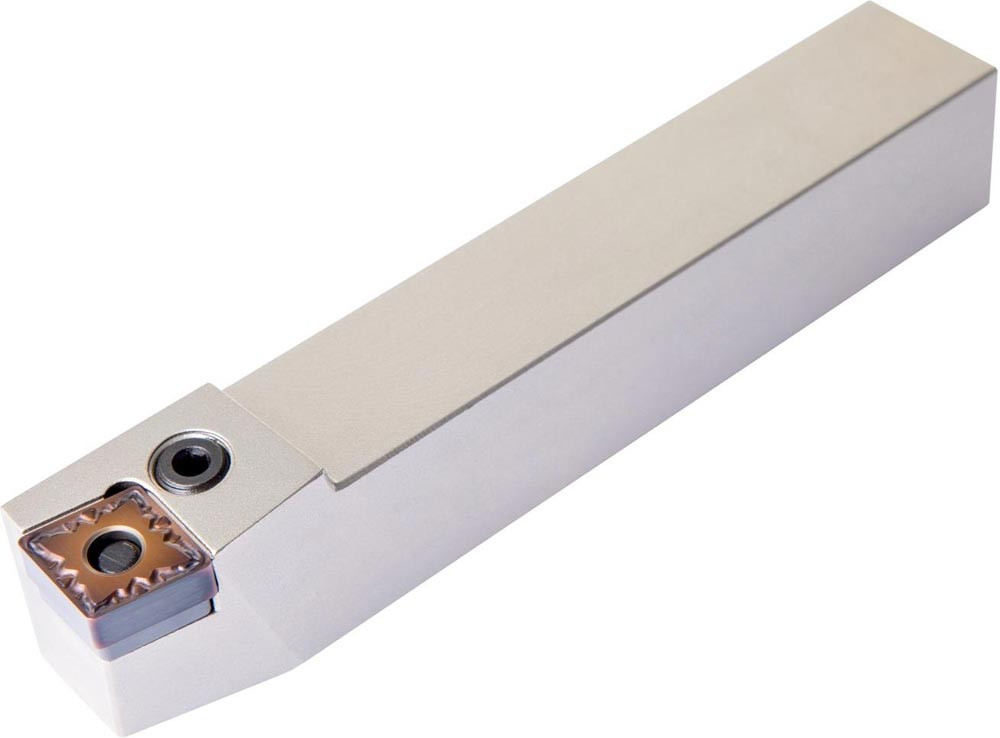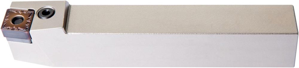Dreh-Trägerwerkzeug mit Kniehebelklemmung zum spannen von 80° Rhombus negative Wendeschneidplatten mit einem Innenkreisdurchmesser von 12.7mm · 4.76mm Dick (ISO Bezeichnung CN.. 1204.. ) · rechte Ausführung zum 75° Stirndrehen mit Zylinderschaft · 20mm Werkzeughöhe x 20mm Breite x 125mm Länge für Kegeldrehen und Längsdrehen ohne Schulter