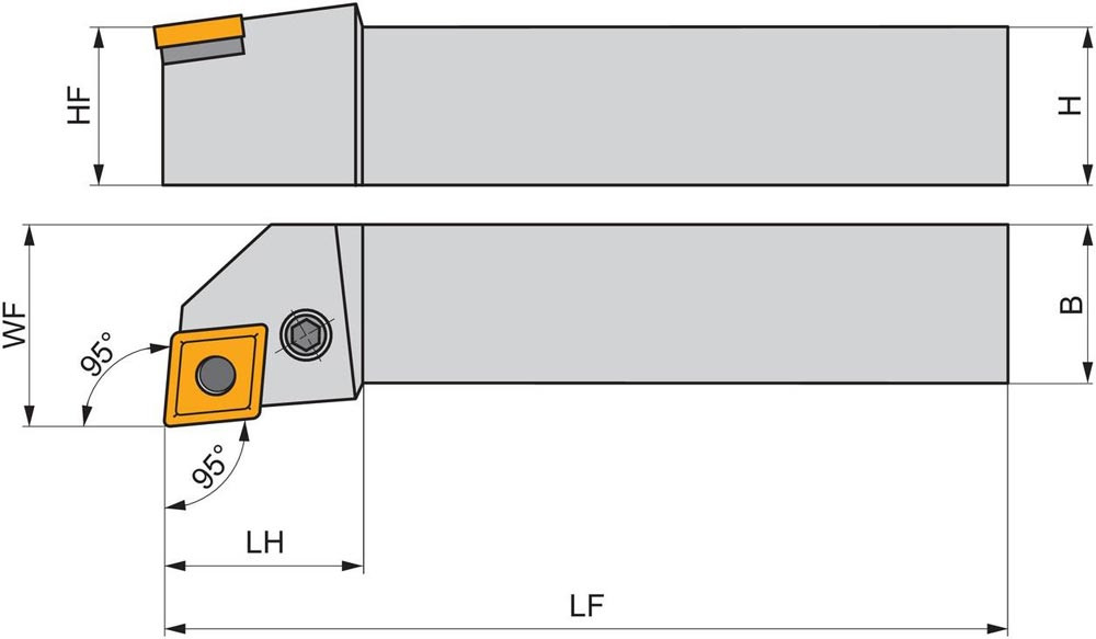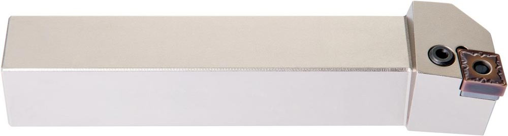 Dreh-Trägerwerkzeug mit Kniehebelklemmung zum spannen von 80° Rhombus negative Wendeschneidplatten mit einem Innenkreisdurchmesser von 19.05mm · 6.35mm Dick (ISO Bezeichnung CN.. 1906.. ) · linke Ausführung zum 95° Stirn-und Längsdrehen mit abgesetzem Schaft · 40mm Werkzeughöhe x 40mm Breite x 250mm Länge für Kegeldrehen · Stirndrehen mit und ohne Schulter und Längsdrehen mit und ohne Schulter