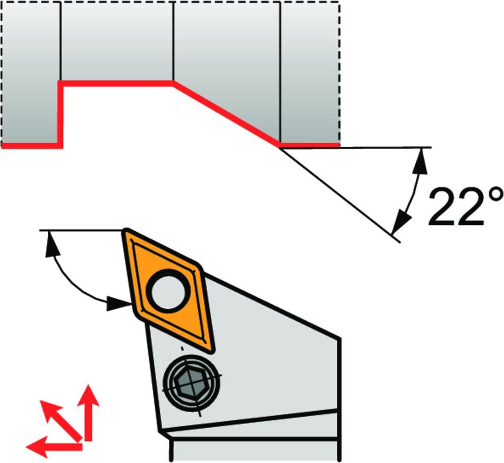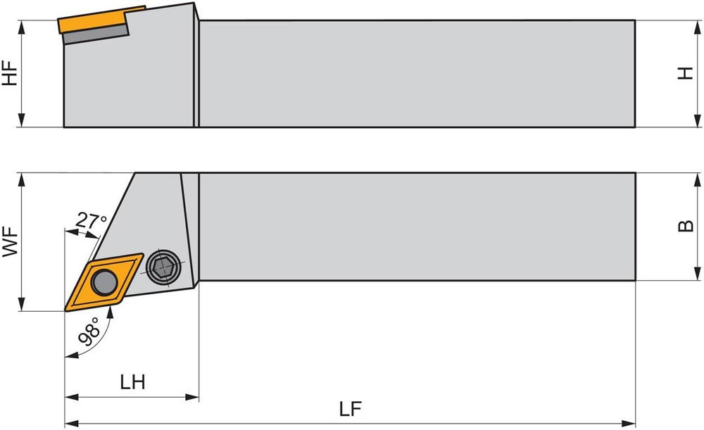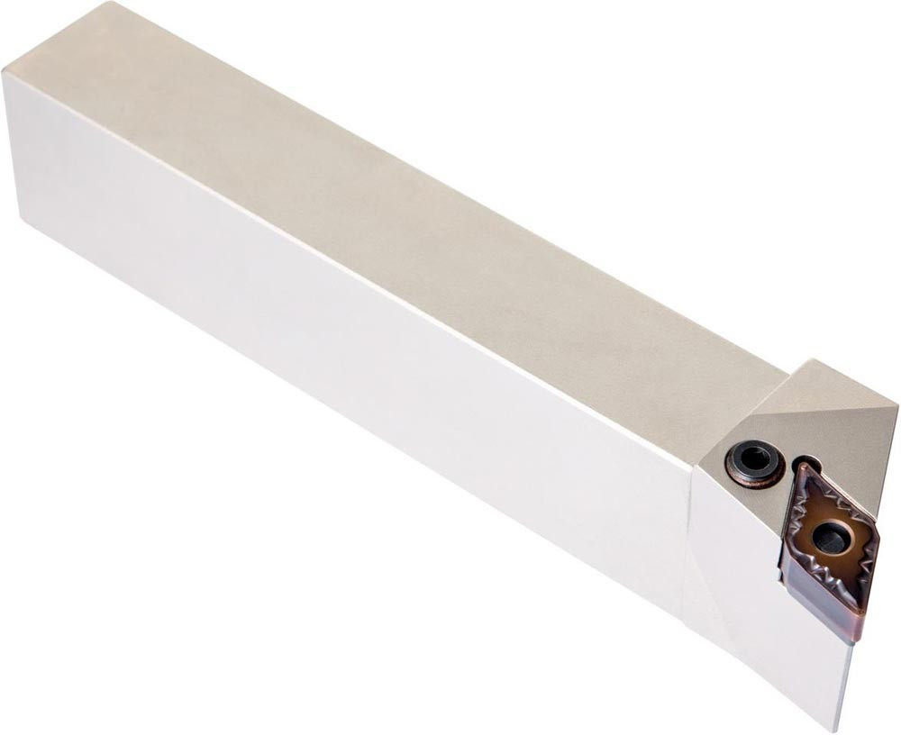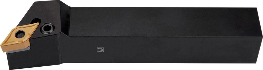 Dreh-Trägerwerkzeug mit Kniehebelklemmung zum spannen von 55° Rhombus negative Wendeschneidplatten mit einem Innenkreisdurchmesser von 12.7mm · 6.35mm Dick (ISO Bezeichnung DN.. 1506.. ) · rechte Ausführung für Sonderanwendungen · 32mm Werkzeughöhe x 25mm Breite x 170mm Länge für Kegeldrehen · Kopierdrehen in einer und mehreren Richtungen und Längsdrehen mit und ohne Schulter