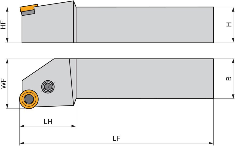 Dreh-Trägerwerkzeug mit Kniehebelklemmung zum spannen von Rund negative Wendeschneidplatten mit einem Durchmesser von 12.7mm · 4.76mm Dick (ISO Bezeichnung RN.. 120400 ) · rechte Ausführung zum Stirndrehen mit abgesetzem Schaft · 25mm Werkzeughöhe x 25mm Breite x 150mm Länge für Kegeldrehen · Stirndrehen ohne Schulter und Längsdrehen ohne Schulter
