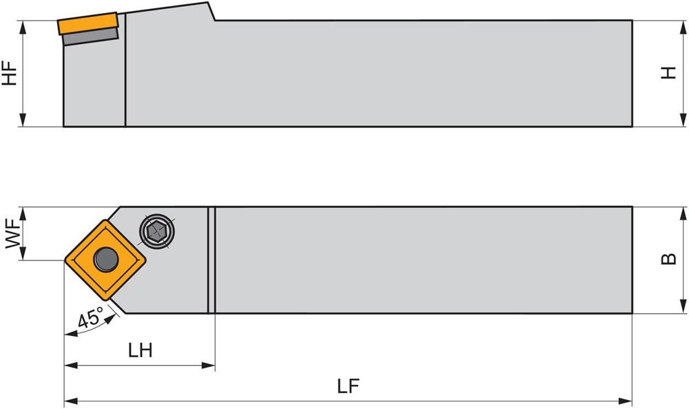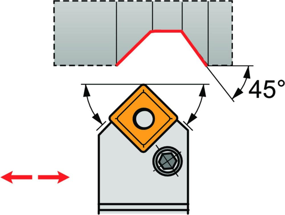 Dreh-Trägerwerkzeug mit Kniehebelklemmung zum spannen von Viereckig negative Wendeschneidplatten mit einem Innenkreisdurchmesser von 25.4mm · 7.94mm Dick (ISO Bezeichnung SN.. 2507.. ) · neutrale Ausführung zum 45° Stirndrehen mit Zylinderschaft · 50mm Werkzeughöhe x 50mm Breite x 300mm Länge für entgraten · Kegeldrehen · Kopierdrehen in einer und mehreren Richtungen und Längsdrehen ohne Schulter