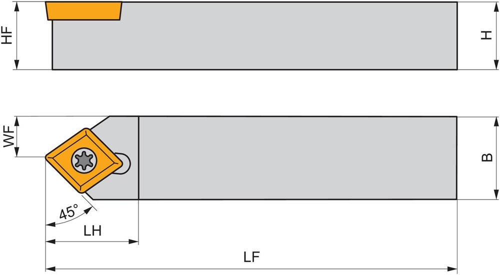 Dreh-Trägerwerkzeug mit Schraubklemmung zum spannen von 80° Rhombus positive Wendeschneidplatten mit einem Innenkreisdurchmesser von 6.35mm · 2.38mm Dick (ISO Bezeichnung CC.. 0602.. ) · rechte Ausführung zum 45° Stirndrehen mit Zylinderschaft · 10mm Werkzeughöhe x 10mm Breite x 70mm Länge für entgraten · Kegeldrehen · Kopierdrehen in einer und mehreren Richtungen und Längsdrehen ohne Schulter