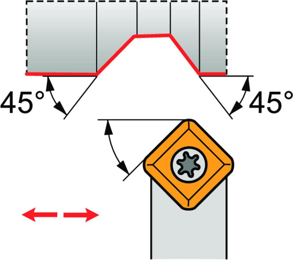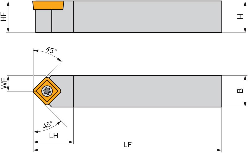 Dreh-Trägerwerkzeug mit Schraubklemmung zum spannen von Viereckig positive Wendeschneidplatten mit einem Innenkreisdurchmesser von 9.525mm · 3.97mm Dick (ISO Bezeichnung SC.. 09T3.. ) · neutrale Ausführung zum 45° Stirndrehen mit Zylinderschaft · 16mm Werkzeughöhe x 16mm Breite x 100mm Länge für entgraten · Kegeldrehen · Kopierdrehen in einer und mehreren Richtungen und Längsdrehen ohne Schulter