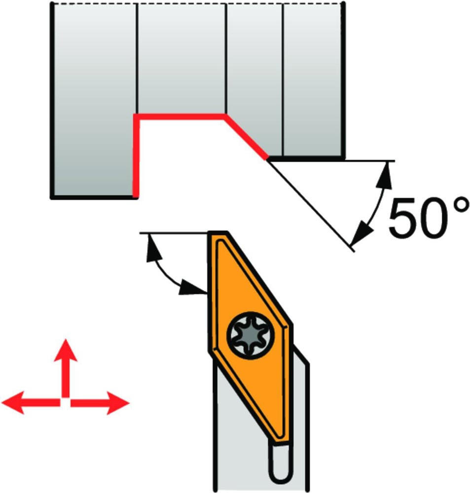 Dreh-Trägerwerkzeug mit Schraubklemmung zum spannen von 35° Rhombus positive Wendeschneidplatten mit einem Innenkreisdurchmesser von 7.94mm · 3.18mm Dick (ISO Bezeichnung VCGX 1303.. ) · rechte Ausführung zum 93° Stirndrehen mit abgesetzem Schaft · 12mm Werkzeughöhe x 12mm Breite x 140mm Länge für Kegeldrehen · Kopierdrehen in einer und mehreren Richtungen und Längsdrehen mit und ohne Schulter