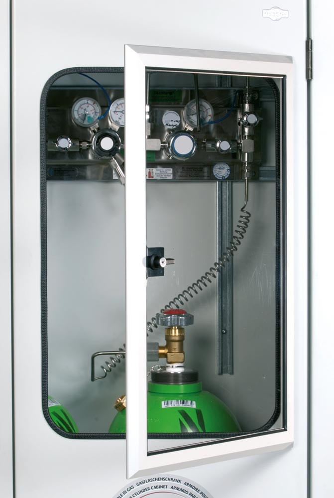 ∙ Hochwertige Stahlblechkonstruktion mit komplett verzinkter und kunststoffbeschichteter Oberfläche in RAL 7035 lichtgrau ∙ Ersetzt die geforderten Schutzbereiche (TRGS 510) um die Gasflaschen ∙ Inklusive Montageschiene, Flaschenhalter und passenden Spanngurten ∙ Edelstahlsockel zum Schutz vor Beschädigungen ∙ Stellfüße für leichtes Ausrichten bei Bodenunebenheiten ∙ Abschließbar mit solider 3-Punkt-Verriegelung über Schwenkhebel