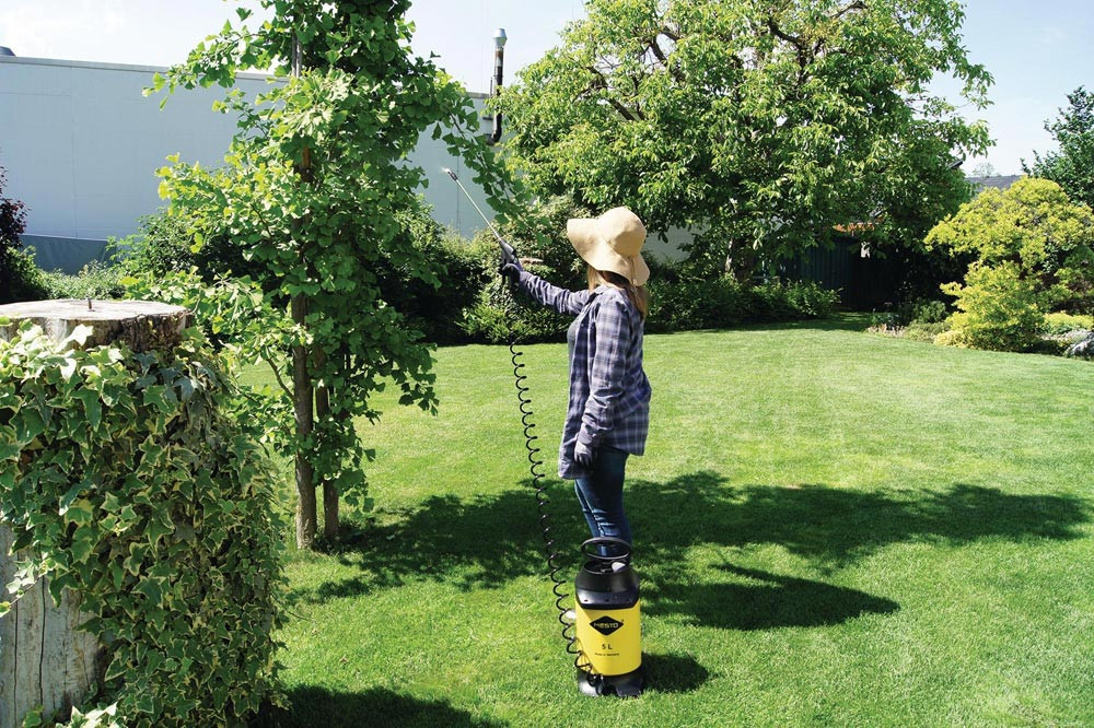 FPM-Dichtung · ergonomisch geformtes Abstellventil mit Manometer und Filtersieb · Kolbenmanometer mit eingebautem Sicherheitsventil · Messing-Spritzrohr 40 cm · 360° drehbar · Messing-Hohlkegeldüse · Spiralschlauch 2,5 m · Kunststoffpumpe mit ergonomischem Pumpengriff · integrierter Einfülltrichter · praktischer Wandhalter · Service-Gutschein