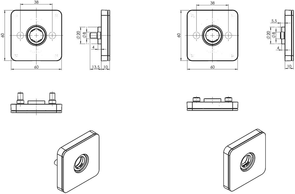 Drückerrosetten unsichtbar verschraubt · quadratisch · im XEA Design · Ausführung: Einzelrosette (DU = mit Durchgangsbohrung) oder Rosetten-Paar · für Vollblatt-Türen · kombinierbar mit allen Türdrückerlochteilen aus dem OGRO-Baukastensystem