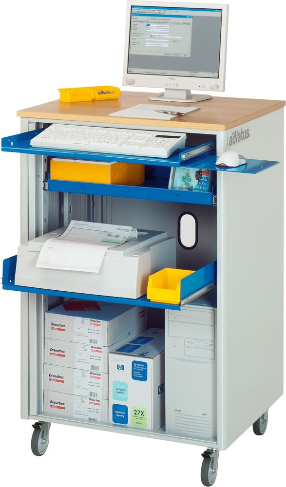 ∙ Buche-Dekor-Arbeitsplatte 25 mm stark, mit gerundeten Ecken und Kanten sowie einem Kabeldurchlass mit Abdeckplatte ∙ Das Unterbaugehäuse ist geteilt und verfügt sowohl im oberen als auch im unteren Bereich über einen jeweils separat zu öffnenden und abschließbaren Rollladen sowie eine 4-fach Energieversorgung inklusive Zuleitung und Kabeldurchlass an der Gehäuserückseite ∙ Oberer Bereich mit ausziehbarer Tastaturschublade BxT 350 x 590 mm, inklusive links oder rechts ausziehbarer Mausauflage BxT 350 x 250 mm ∙ Unterer Bereich mit Ausziehschublade, Auszugboden und Ablageboden - Ausziehschublade und Auszugsboden sind in der Höhe verstellbar ∙ Wahlweise stationär mit verstellbaren Füßen zum Ausgleichen von Bodenunebenheiten oder fahrbar mit 2 Lenk- und 2 Bockrollen ∙ Optional mit Monitorgehäuse lieferbar (Beschreibung siehe unten) ∙ Umweltfreundliche Pulverbeschichtung: Gehäuse RAL 7035 lichtgrau, Einbauten RAL 5010 enzianblau