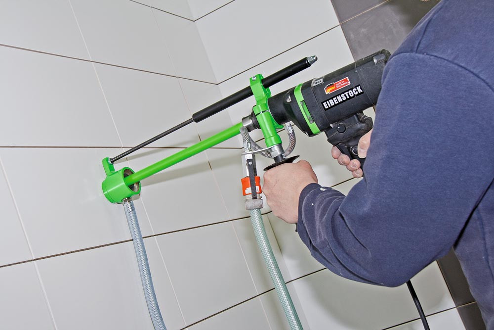 Ausführung: Diamant-Bohrmaschine für Bohrungen in Naturstein, Fliesen, Glas und armierten Beton ∙ Mit Elektronik ‑ Sanftanlauf, Drehzahlregelung und ‑konstanthaltung ∙ Temperatur- und - Überlastabschaltung ∙ Integrierte Wasserzuführung mit Wassermengenregulierung ∙ Korrosionsbeständige Edelstahlspindel ∙ Personenschutzschalter ∙ Stationär in unterschiedlichen Bohrständern einsetzbar, Spannhals-Ø 53 mm ∙ Einsatzspektrum im Bau-, Installations-, Naturstein- und Fliesenlegergewerbe