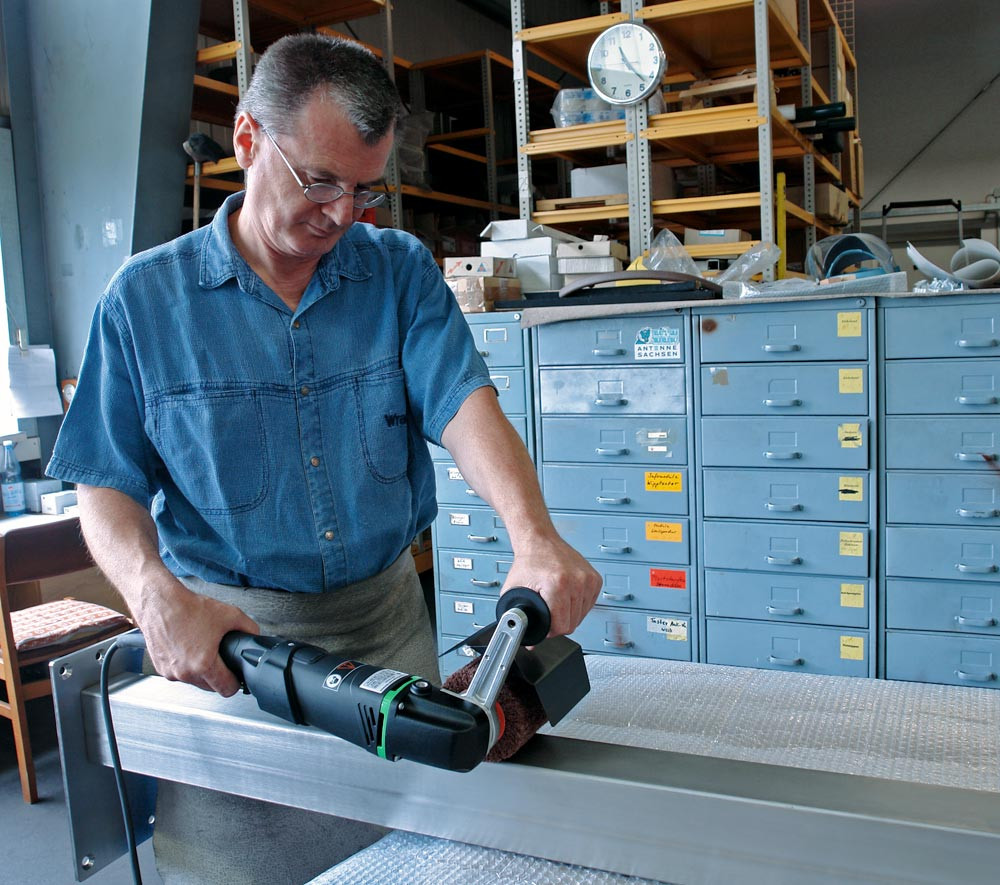 Ausführung: Leistungsstarke Satiniermaschine mit Elektronik für stufenlose Drehzahländerung, konstante Drehzahl unter Last und Drehzahlabsenkung bei Überlast ∙ Mit Sanftanlauf und Temperaturbegrenzung ∙ Zweifache Getriebeuntersetzung für max. Durchzugskraft und lange Lebensdauer ∙ Zum Grobschliff, Feinschliff und Hochglanzpolieren von Metall, Kunststoff und Holz