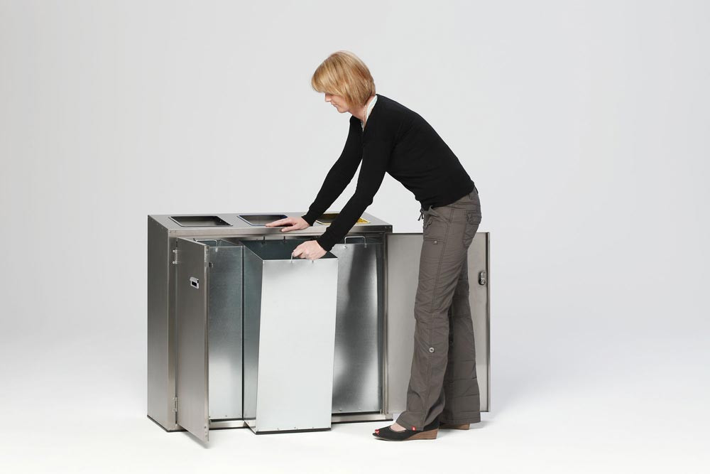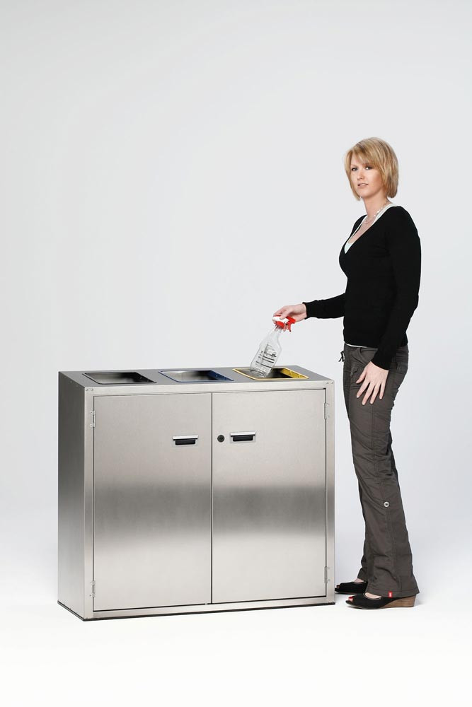 · Gefertigt aus Edelstahlteilen · 3 Einwurföffnungen mit farbigen Ringen aus verzinktem und pulverbeschichteten Stahlblech zur Wertstofftrennung, Farbe grau für Restmüll, blau für Papier, gelb für Wertstoffe · 4 verstellbare Füße für Niveauausgleich · Verschließbare Doppelflügeltür mit Doppelbartschloss und Griffmulden · 3 Inneneinsätze aus Edelstahl mit Bügelgriffen und einem Volumen von je ca. 90 Liter