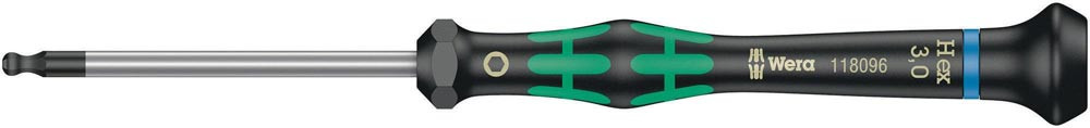 Hochwertiger Wera Micro Schraubendreher für feinmechanische Verschraubungen. Kugelkopfprofil: Durch die kugelförmigen Abtriebsprofile ist ein Auslenken oder Schwenken der Werkzeugachse zur Schraubenachse möglich · so dass dadurch ″um die Ecke″ geschraubt werden kann. Durch Abstützen der Hand auf der Drehkappe und durch die Schnelldrehzone unterhalb der Drehkappe ist blitzschnelles Zwirbeln möglich. Zeitintensives Umgreifen entfällt. Kraftzone mit integrierten Weichzonen sorgt für die Übertragung hoher Löse- und Anzugsmomente. Präzisionszone für den richtigen Drehwinkel bei Justierarbeiten. Die Wera Black Point-Spitze bietet Passgenauigkeit und optimierten Korrosionsschutz. Take it easy Werkzeugfinder mit Farbkennzeichnung nach Profilen und Größenstempelung - zum einfachen und schnellen Finden des benötigten Werkzeugs.