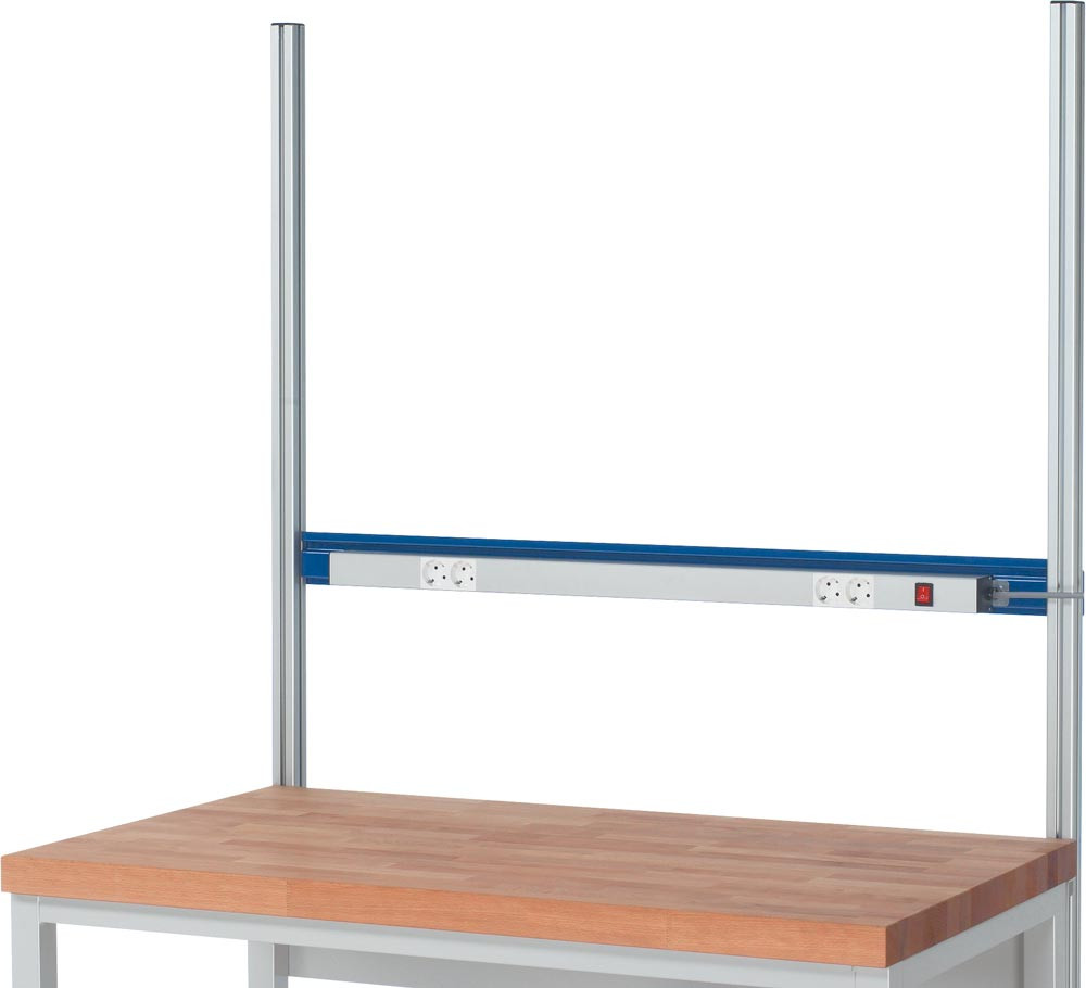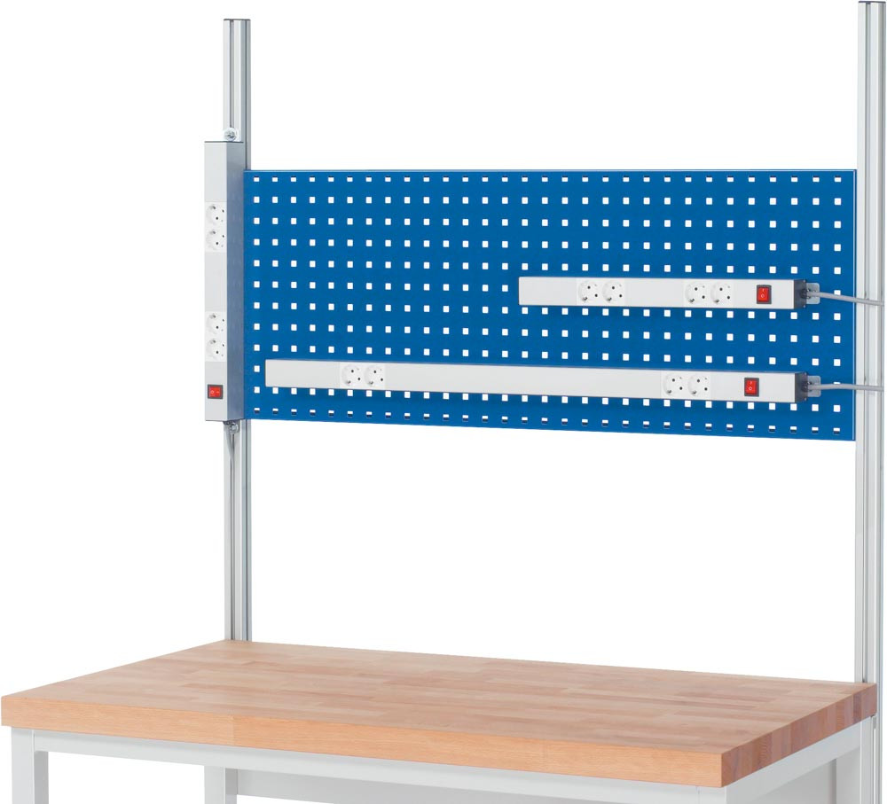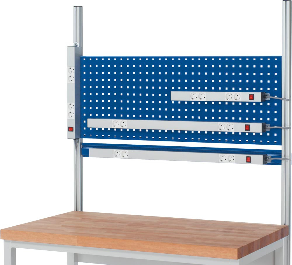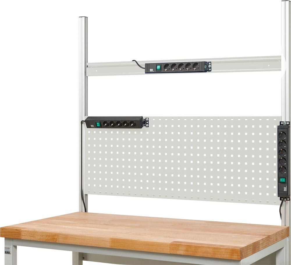 ∙ Montage an System-Stützen (allseitig), auf Lochplatte oder an Halteschiene für Sichtlagerkästen · Energieleiste mit 5 Schutzkontakt-Steckdosen, Ein-/Ausschalter (beleuchtet) und Anschlusskabel 2000 mm mit Stecker · Montage mit Neigung bis zu 30° möglich