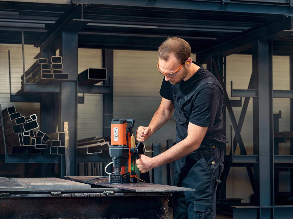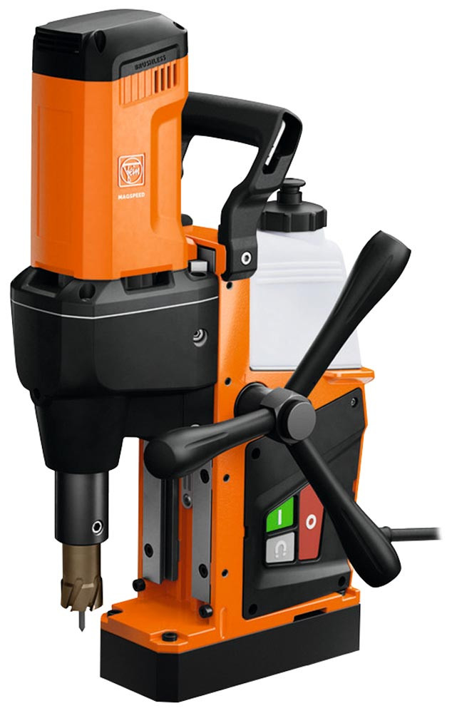 Kleine und leichte 1-Gang Endurance-Magnet-Kernbohrmaschine ∙ Dank einzigartiger Performance wird die Bohrzeit halbiert ∙ Schnittgeschwindigkeiten von bis zu 70 m/min ∙ Extrem verschleißarmes Maschinenkonzept mit bürstenlosem 1 600 W Hochleistungsmotor ∙ Integrierter Kühlmitteltank sorgt für hohe Kernbohrerstandzeiten ∙ Kippsensor stoppt unmittelbar den Bohrmotor beim Verrutschen oder Kippen der Maschine