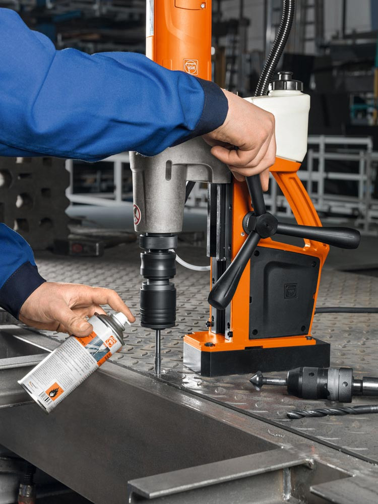 Leichtgewichtige und hubstarke 2-Gang-Universal-Magnet-Kernbohrmaschine ∙ 1200 W Hochleistungsmotor mit Tachoelektronik für hohe Drehzahlstabilität für zuverlässiges Arbeiten ∙ Durch Rechts-/Linkslauf, elektronische Drehzahleinstellung und 315 mm Hubbereich ist ein universeller Arbeitseinsatz, wie Kern-, Spiral-, Gewindebohren sowie Senken und Reiben möglich ∙ Mit schwenkbar gelagertem Motorkabel-Schutzschlauch ∙ MK3-Werkzeugaufnahme ∙ Integrierter Kühlmitteltank sorgt für hohe Kernbohrerstandzeiten ∙ Drehzahlspeicher "Memory Function"