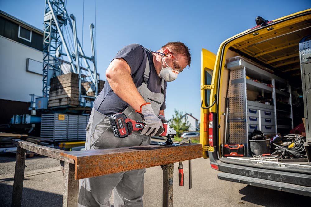 Lieferumfang: 2 Akku-Packs, Schutzhaube, Handgriff, Stirnlochschlüssel, Spannflansch, Spannmutter, Koffereinlage und Ladegerät in L-BOXX®136
