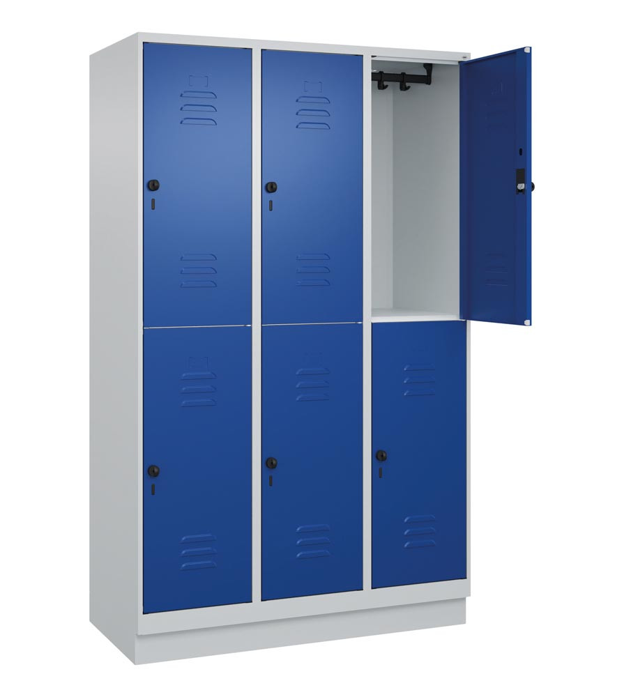 Fächerschrank, doppelstöckig, BxTxH 1200x500x1950 mm, 3x2 Fächer, Abt.B 400 mm, Drehriegel, Sockel, RAL 7035/5010