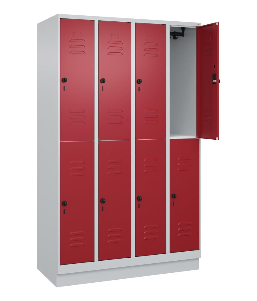 Fächerschrank, doppelstöckig, BxTxH 1200x500x1950 mm, 4x2 Fächer, Abt.B 300 mm, Drehriegel, Sockel, Farbwahl