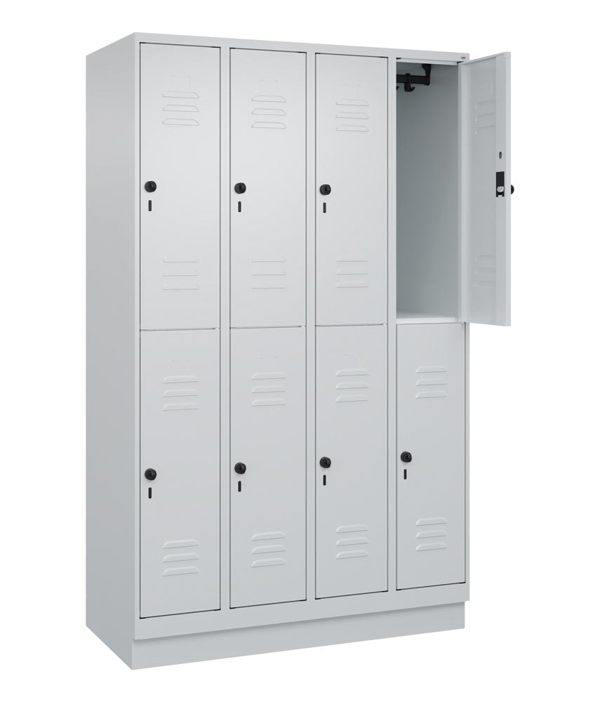 Fächerschrank, doppelstöckig, BxTxH 1200x500x1950 mm, 4x2 Fächer, Abt.B 300 mm, Drehriegel, Sockel, RAL 7035