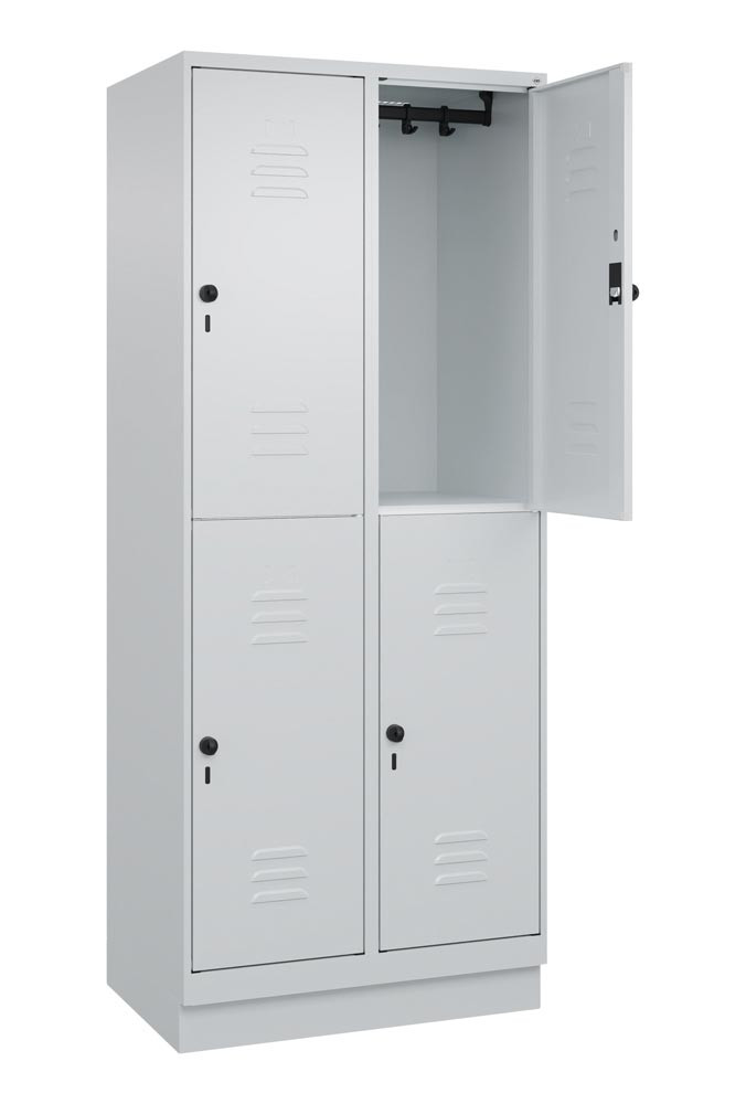 Fächerschrank, doppelstöckig, BxTxH 800x500x1950 mm, 2x2 Fächer, Abt.B 400 mm, Drehriegel, Sockel, RAL 7035