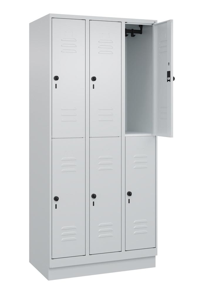 Fächerschrank, doppelstöckig, BxTxH 900x500x1950 mm, 3x2 Fächer, Abt.B 300 mm, Drehriegel, Sockel, RAL 7035