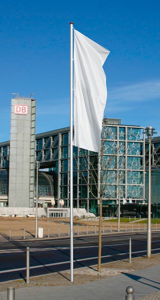 ∙ Aus korrosionsfreiem Hartaluminium ∙ Silberfarbig eloxiert - fahnentuchschonend ∙ Mit vollständig innenliegender Hissvorrichtung ∙ Betätigung der Hissvorrichtung erfolgt mit einer Spezialkurbel, wodurch eine gute Sicherung gegen die Bedienung durch Unbefugte und Diebstahl der Fahne gegeben ist ∙ Fahnentuch wird an verstellbaren Kunststoffgleitern, die im Mast geführt werden, befestigt ∙ Serienmäßig mit abschließbarer Hissvorrichtung ∙ Inklusive Bodenhalterung mit Zentrierkeil