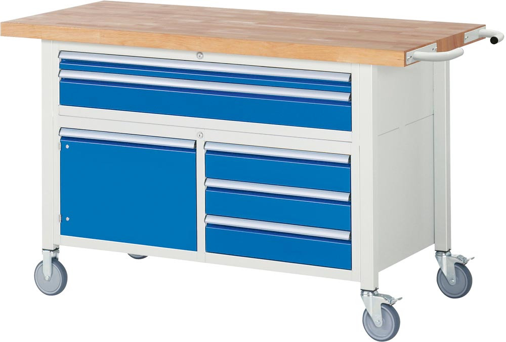 Fahrbare Werkbank, BxTxH 1250x700x880 mm, 2 XXL Schubladen: 1x60/1x120 mm, 3x120 mm, 1 Tür 360 mm, Platte Buche 40 mm, RAL 7035/5010