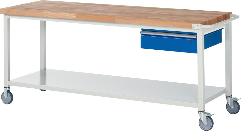 Fahrbare Werkbank, BxTxH 2000x700x880 mm, 1 Schublade 150 mm, Ablageboden, Platte Buche 40 mm, RAL 7035/5010 EP529992