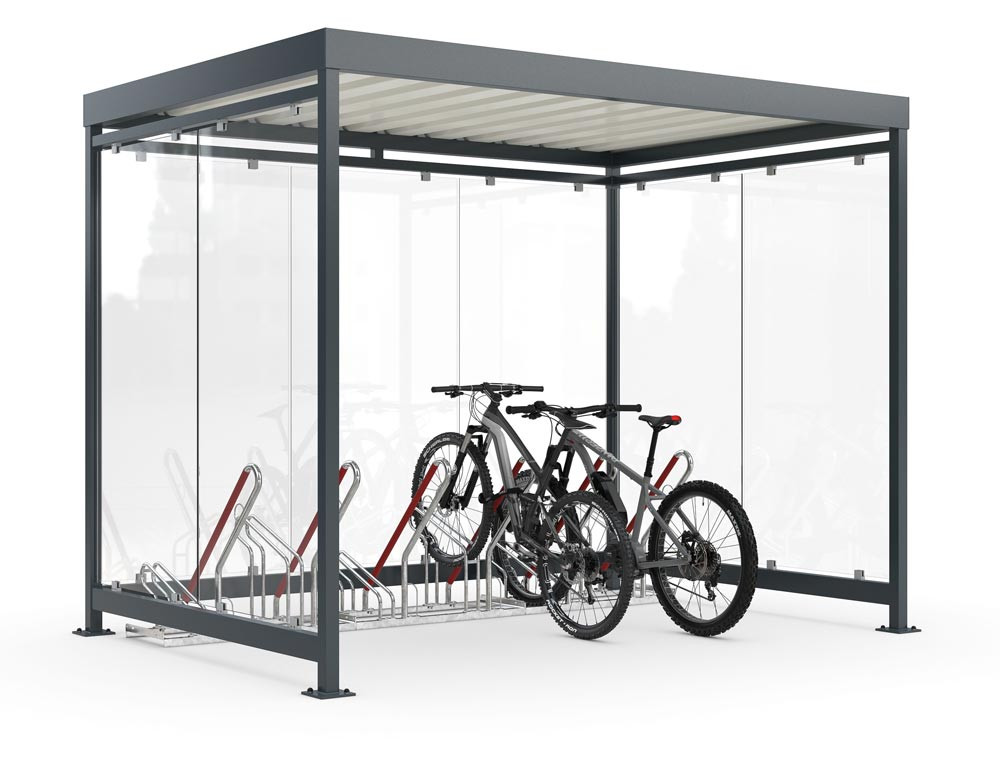 ∙ Feuerverzinkte Flachdach-Stahlkonstruktion inkl. komfortablem Anlehnsystem ∙ Schützt hochwertige Fahrräder vor Beschädigung und Diebstahl ∙ Einscheibensicherheitsglas mit Glashaltern ∙ Entwässerung erfolgt über bodenseitige Wasserspeier ∙ Für sehr hohe Wind- und Schneelasten geeignet ∙ Für Reifenbreiten bis 55 mm ∙ Inkl. Fahrradständer ∙ Ohne Überpflasterung