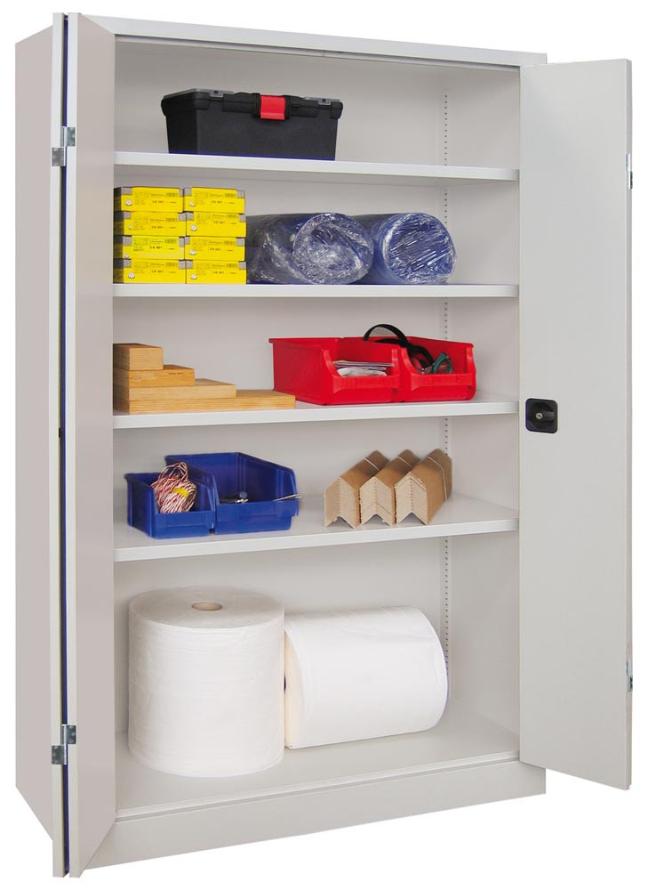 ∙ Stabile Stahlblechkonstruktion ∙ Oberfläche pulverbeschichtet ∙ Schränke mit gemeinsam verschließbaren Vollblech-Falttüren und Verstärkungstaschen ∙ Die Türen sind über einen dreiriegeligen Drehgriff mit integriertem Zylinderschloss inkl. 2 Schlüsseln verschließbar ∙ Böden im Raster von 17 mm höhenverstellbar, Belastbarkeit je Boden 80 kg bei gleichmäßig verteilter Last ∙ Max. Gehäusebelastbarkeit 600 kg
