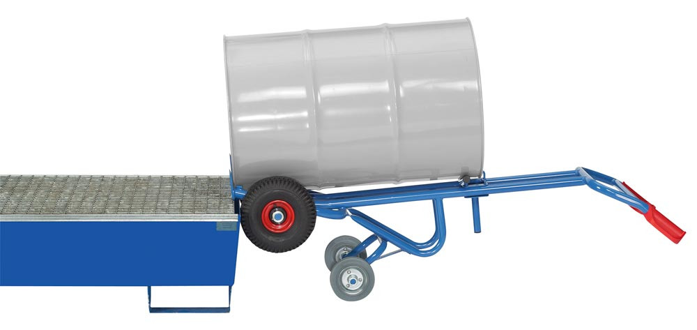 Fasskarre, für 200-l-Fässer mit Rand, BxH 680x1600 mm, Traglast 300 kg, Luftbereifung, mit Stützradsatz, RAL 5007 brillantblau