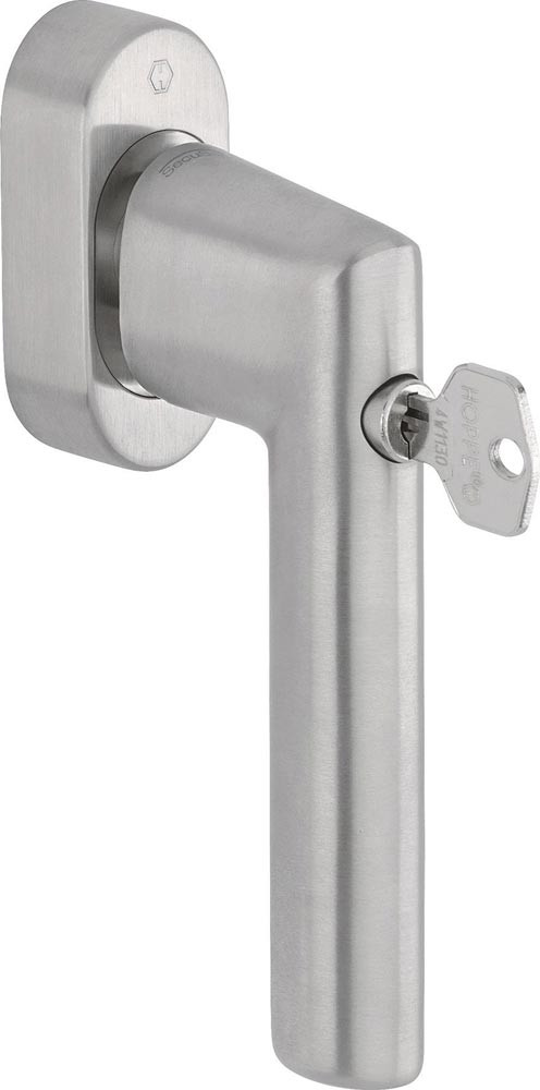 Edelstahl-Dreh-/Kipp-Fenstergriff mit SecuForte® und VarioFit®· abschließbar · Schließung durch Drehzylinder · geprüft nach DIN EN 13126-3: 23/180-0133/33/C1 und RAL-GZ 607/9, RAL200, erfüllt die Anforderungen nach DIN EN 1627-1630 RC1-6 · Stift: HOPPE-Vollstift · Befestigung: verdeckt, Gewindeschrauben M5 · automatische Sperrfunktion in Geschlossen-Stellung (0°) und in Kippstellung (180°)