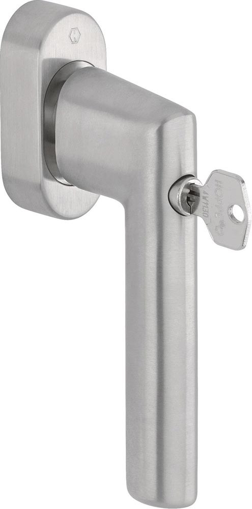 Edelstahl-Dreh-/Kipp-Fenstergriff mit SecuForte® und VarioFit®· abschließbar · Schließung durch Drehzylinder · geprüft nach DIN EN 13126-3: 23/180-0133/33/C1 und RAL-GZ 607/9, RAL200, erfüllt die Anforderungen nach DIN EN 1627-1630 RC1-6 · Stift: HOPPE-Vollstift · Befestigung: verdeckt, Gewindeschrauben M5 · automatische Sperrfunktion in Geschlossen-Stellung (0°) und in Kippstellung (180°)
