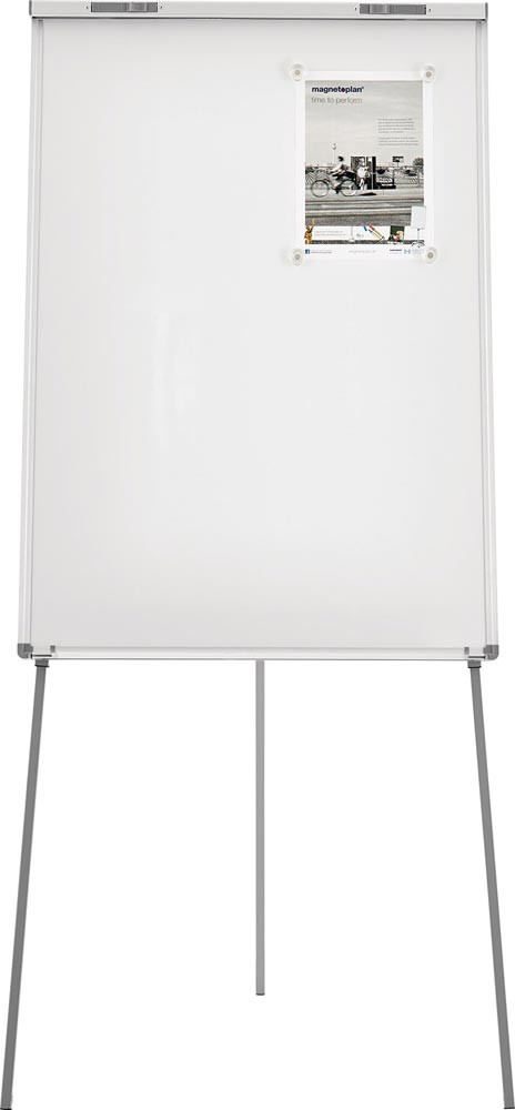 Rückwand aus Metall, für mehr Stabilität · Dreibeinstativ, stufenlos höhenverstellbar bis 1850 mm · magnethaftende, lackierte Metalloberfläche · mit Boardmarkern beschreibbar und trocken abwischbar · Klemmleiste mit Schnellverschluss, zum Feststellen von Flipchart-Papier · durchgehende, klappbare Ablageschale, für Marker und Zubehör · Farbe astral silber