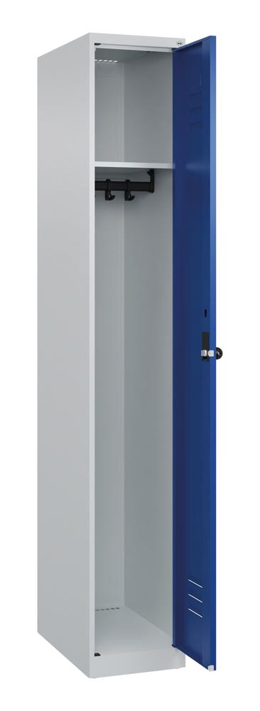 Garderobenschrank, BxTxH 300x500x1850 mm, 1 Abteil, B 300 mm, Bodenstehend, Drehriegel, RAL 7035/5010 EP558527