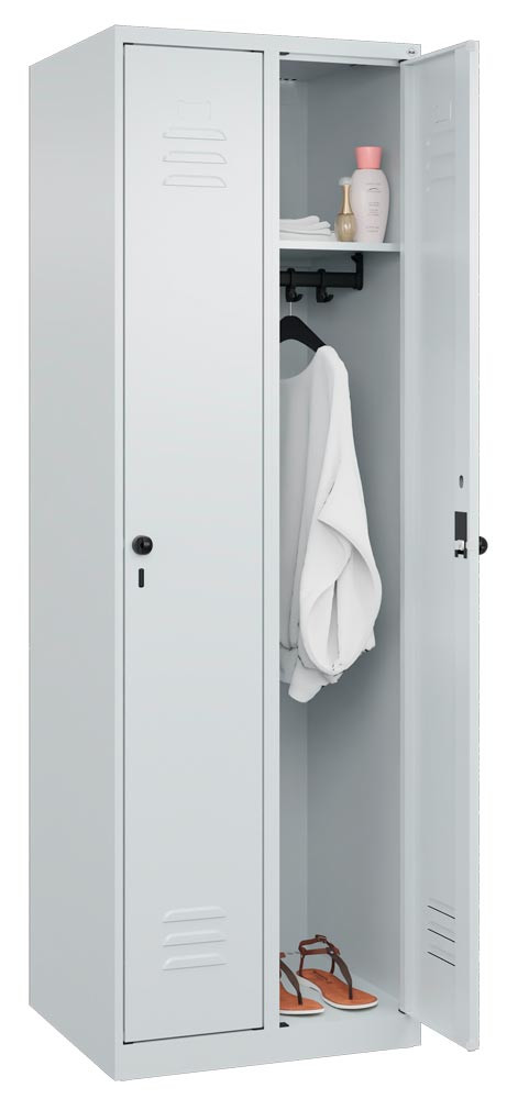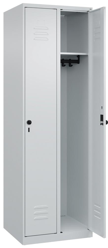 · Stabile Stahlblechkonstruktion mit hochwertiger Einbrennbeschichtung · Jedes Abteil mit 1 fest eingeschweißtem Ablageboden und 1 stabilen Garderobenstange mit 3 verdrehsicheren Doppel - Schiebe - Haken · Eingestanzter Etikettenrahmen · Auch mit werksseitig montierten Füßen oder Sockel erhältlich · Füße bei Korpusfarbe RAL 7035 in lichtgrau und bei allen anderen Korpusfarben in schwarzgrau · Sicherheitsdrehriegel für Vorhängeschlösser · Auch mit Pfand-, Kassier und elektrischen Schließsysteme gegen Aufpreis erhältlich · In vielen Farbkombinationen erhältlich