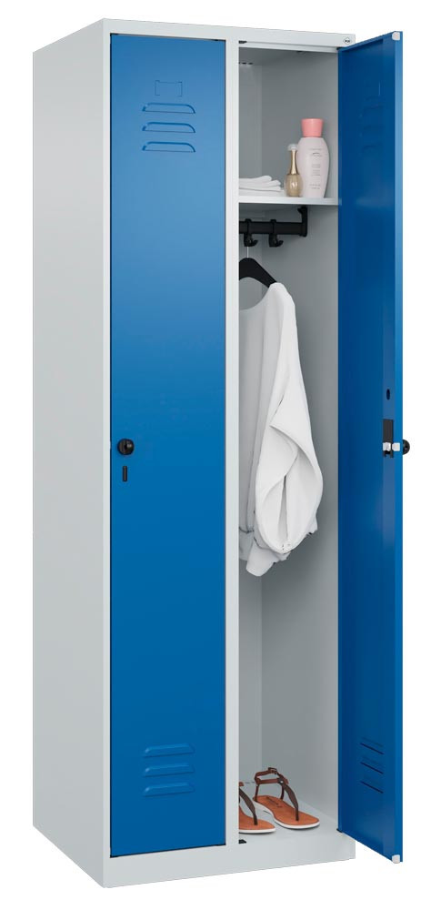 · Stabile Stahlblechkonstruktion mit hochwertiger Einbrennbeschichtung · Jedes Abteil mit 1 fest eingeschweißtem Ablageboden und 1 stabilen Garderobenstange mit 3 verdrehsicheren Doppel - Schiebe - Haken · Eingestanzter Etikettenrahmen · Auch mit werksseitig montierten Füßen oder Sockel erhältlich · Füße bei Korpusfarbe RAL 7035 in lichtgrau und bei allen anderen Korpusfarben in schwarzgrau · Sicherheitsdrehriegel für Vorhängeschlösser · Auch mit Pfand-, Kassier und elektrischen Schließsysteme gegen Aufpreis erhältlich · In vielen Farbkombinationen erhältlich