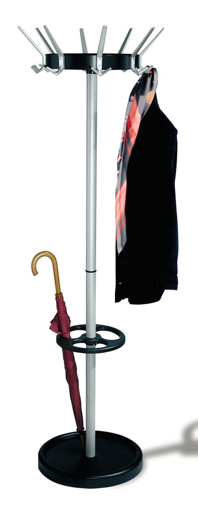Garderobenständer, Durchm.xH 475x1710 mm, drehbare Hakenkrone, 8 Hut- + 16 Mantelhaken, Schirmständer, alusilber/schwarz EP518877
