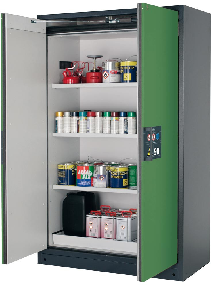 ∙ Extrem robuste Bauweise ∙ Kratzunempfindliche Strukturlackierung ∙ Mit einer Hand zwei Türen öffnen (AGT)Serienmäßige Tür-Schließ-Automatik (TSA) schließt nach ca. 60 Sekunden die arretierten Türen, optisches und akustisches Warnsignal vor Türschließung · Sicheres Arbeiten mit integrierter Türfeststellanlage ∙ Im Brandfall schliessen die Türen selbständig über den eingebauten Thermoauslöser ∙ Feuersicherheit 90 Minuten ∙ Manipulationssicheres Schloss mit Anzeige des momentanen Schließzustandes (Integration in Schließanlage möglich) ∙ Fest integrierter, unterfahbarer Sockel (Sockelblende optional erhältlich) ∙ Leichtes Umsetzen mit Gabelhubwagen möglich ∙ Standardkorpus RAL 7016 anthrazit