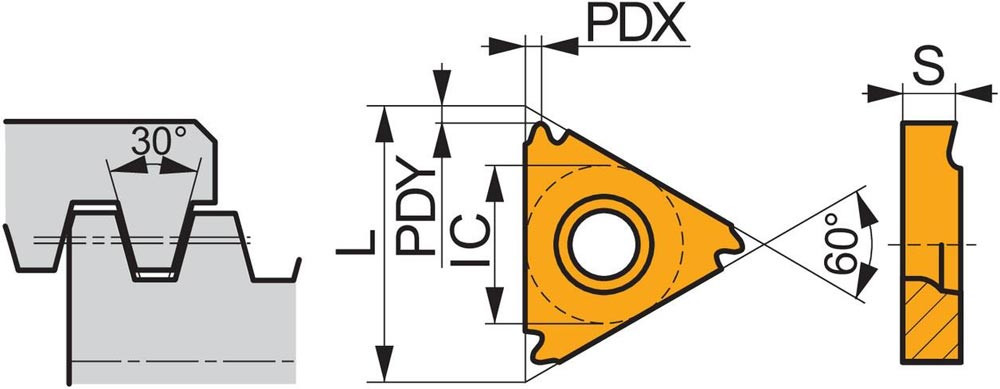 Einseitige Gewindedreh-Wendeschneidplatte · dreieckig mit einem Innenkreisdurchmesser von 12.7mm · für linksschneidende Werkzeuge für Trapezförmiges TR-Außengewinde mit 4mm Steigung · T8030 PVD beschichtet feinkörniges WC-Co-Hartmetall innerhalb der ISO-Substrats-Bereiche P25-P40/M20-M35 und K20-K40 zum zerspanen von Stahl · Edelstahl und Guss