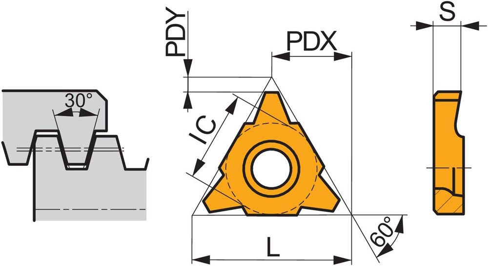Einseitige Gewindedreh-Wendeschneidplatte · dreieckig mit einem Innenkreisdurchmesser von 12.7mm · für rechts-und linksschneidende Werkzeuge für Trapezförmiges TR-Außengewinde mit 6mm Steigung · T8030 PVD beschichtet feinkörniges WC-Co-Hartmetall innerhalb der ISO-Substrats-Bereiche P25-P40/M20-M35 und K20-K40 zum zerspanen von Stahl · Edelstahl und Guss in Kombination mit einem SE (RL) -S Gewindedrehwerkzeug