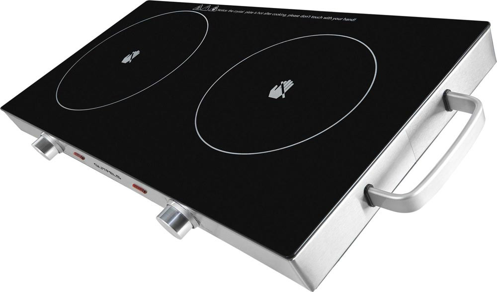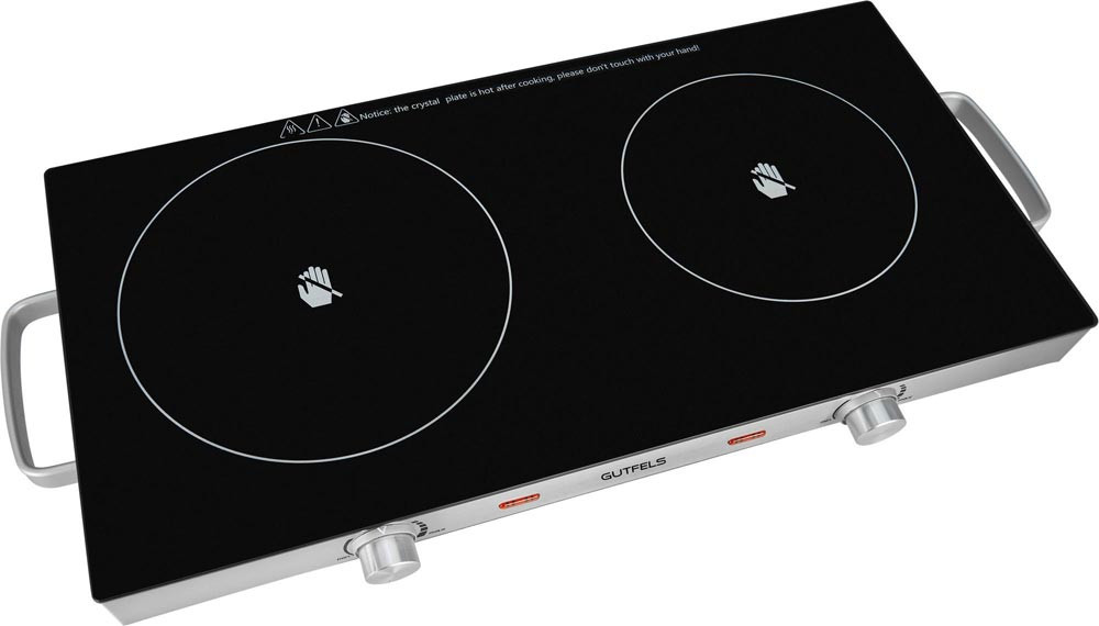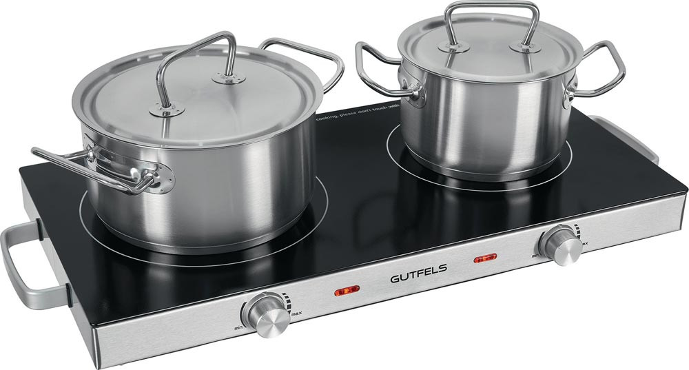 1800 + 1000 Watt Leistung · 2 Kochzonen Ø 20,0 cm und Ø 16,5 cm · stufenlose Temperaturregelung mit Kontrollleuchten · Überhitzungsschutz