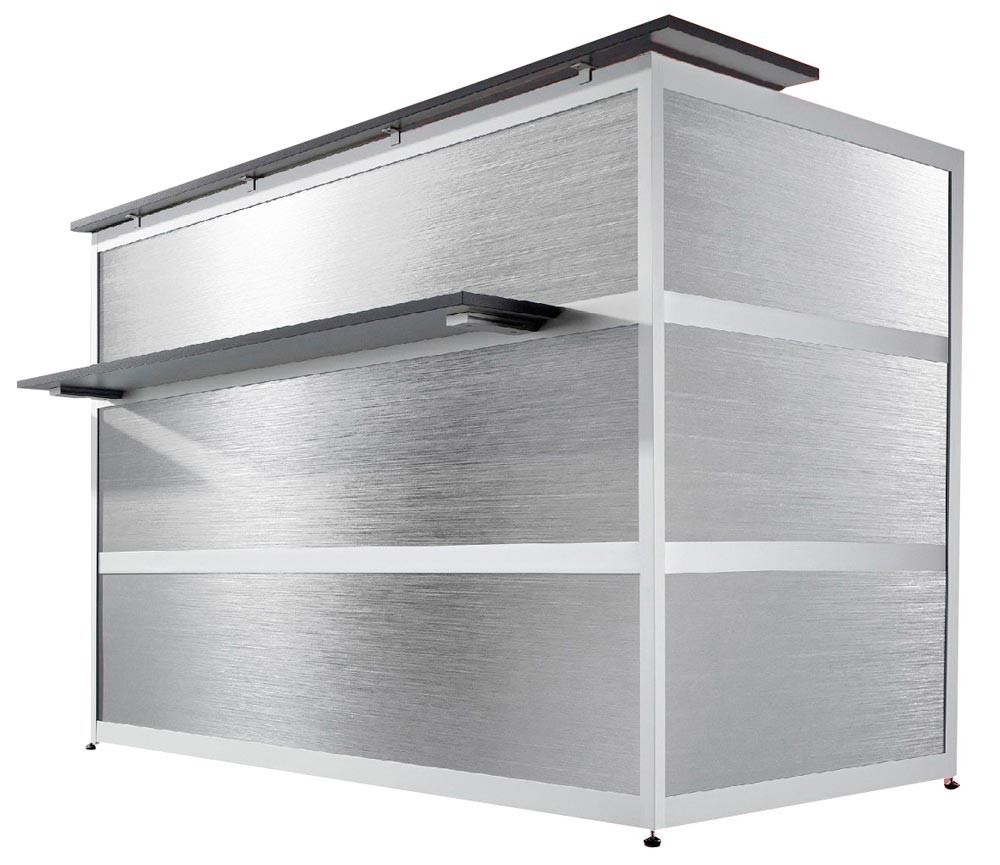 ∙ Alle Thekenelemente mit allseitigem Aluminiumrahmen 25 x 25 mm ∙ Thekenfront in 3-teiliger Optik 46 x 15 mm