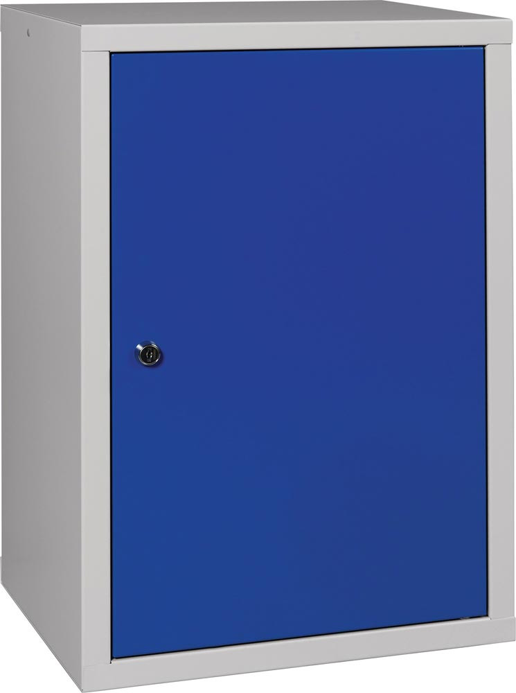 stabile Stahlblechkonstruktion, pulverbeschichtet · Türen aus Vollblech, abschließbar mit Zylinderschloss · Fachboden höhenverstellbar, Tragfähigkeit 15 kg