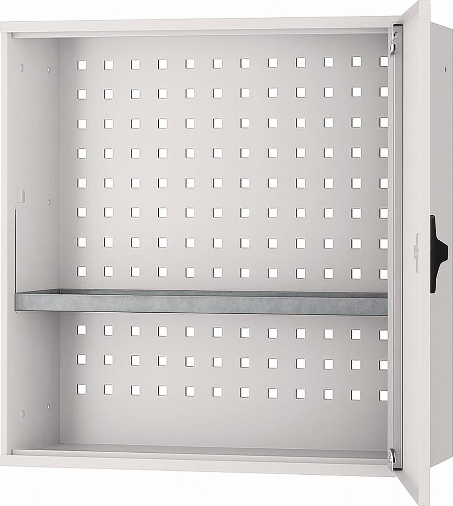 mit einer Flügeltür · Flügeltür innenliegend, bündig mit Gehäuse · Türöffnungswinkel ca. 100° · Fachboden aus verzinktem Stahlblech · Griffschalenschloss inkl. 2 x Schlüssel · Verriegelung seitlich · Blechstärke 1 mm · Tragfähigkeit 35 kg · zur Wandbefestigung
