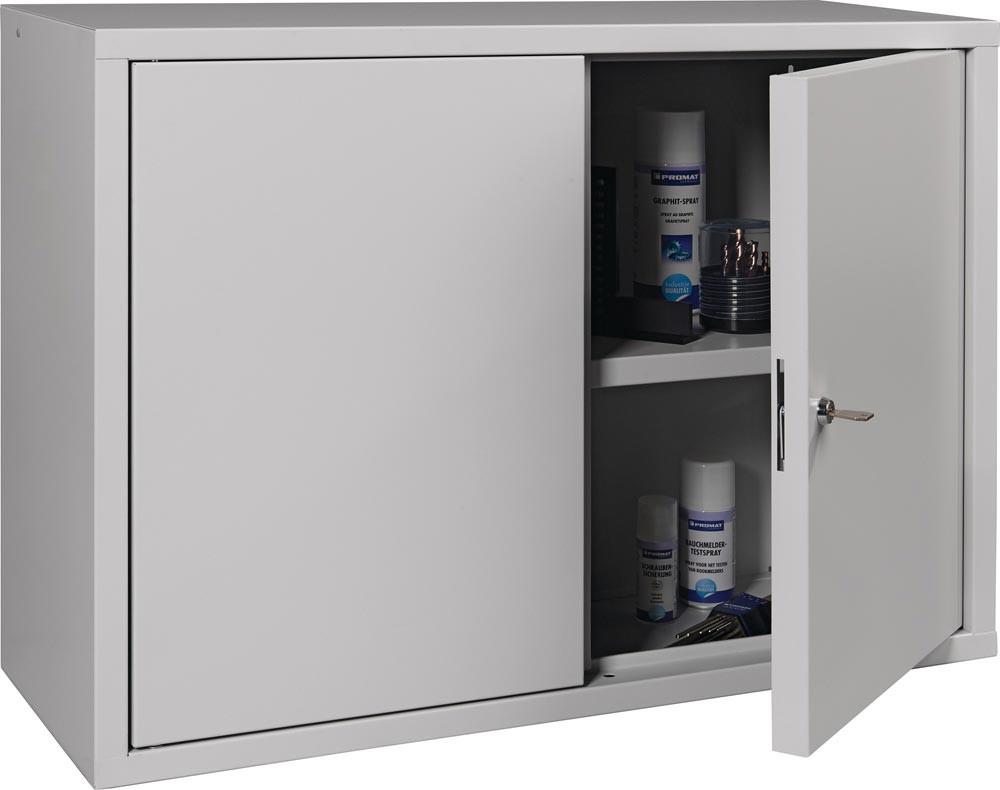 stabile Stahlblechkonstruktion, pulverbeschichtet · Türen aus Vollblech, abschließbar mit Zylinderschloss · Fachboden höhenverstellbar, Tragfähigkeit 15 kg