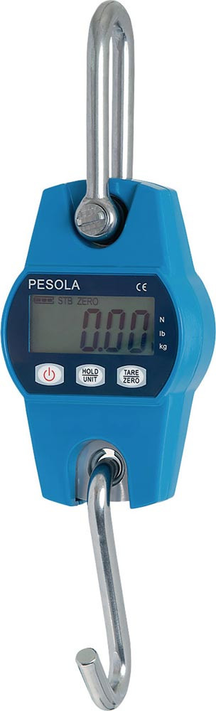 robuste Bauweise · Metallgehäuse · rostfreier Schäkel (oben) und Haken (unten) erlaubt das stabile Anbringen von schweren Lasten · Folientastatur · Wechsel von kg auf Pfund · beleuchtete LCD Anzeige