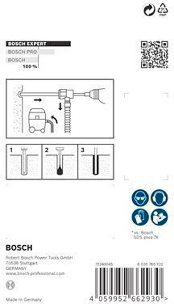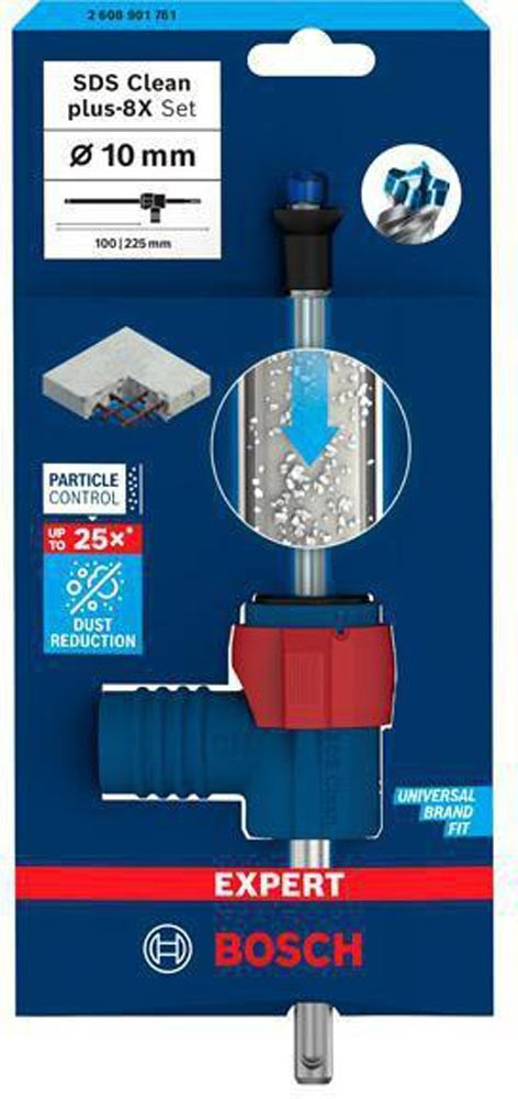 Bohren in Stahlbeton mit verbesserter Staubreduzierung! Durchdringt Stahlbeton mit einem Voll-Carbide-Kopf mit 4 Schneidern Installateure und Bauarbeiter wissen nur zu gut · dass beim Bohren in Beton große Mengen an Staub anfallen. Besonders unangenehm ist dies beim Bohren über Kopf oder beim Bohren und Reinigen für chemische oder mechanische Dübel. Für diese anspruchsvollen Arbeiten haben wir das EXPERT SDS Clean plus-8X Set entwickelt. Mit diesem Set bohrst und entfernst du gleichzeitig Staub und Bohrmehl · sodass mühsame Reinigungsarbeiten entfallen. Mit EXPERT SDS Clean plus-8X Set wird der Staub beseitigt · wenn du über Kopf oder eine ganze Reihe von Löchern für mechanische oder chemische Dübel bohren musst. Der Bohrer ist mit einem Vollhartmetallkopf mit 4 Schneiden und innenliegendem Absaugkanal ausgestattet. Zudem haben wir den SDS Clean plus Anschluss verbaut · der für alle SDS Clean plus-8X Bohrer geeignet ist und sich leicht montieren und abnehmen lässt. Er verbindet die Bohrmaschine mit Staubabsaugungen · sodass Staub und kleines Bohrgut durch den integrierten Absaugkanal aus dem Bohrloch extrahiert werden kann. Die vormontierte Staubkappe unterstützt das Auffangen von Schmutz und Staub · sobald du mit dem Bohren beginnst. Hocheffizienter Abtransport von Staub mit Bosch Particle Control