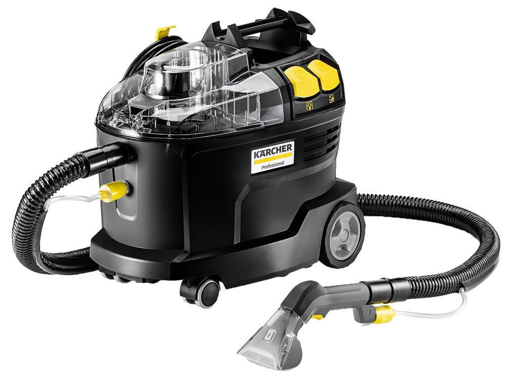 Robuster Waschsauger für die Polsterreinigung und Fleckentfernung auf textilen Flächen ∙ Limitierte Edition aus schwarzem, mitb44% recyceltem Kunststoff ∙ Sprühextraktionsgerät sprüht die Reinigungslösung tief in die Textilfasern ein und saugt diese anschließend inklusive des gelösten Schmutzes wieder ab ∙ Ideal für die Reinigung im Hotel- und Gaststättengewerbe oder in der Fahrzeuginnenreinigung ∙ Einfache Bedienung durch 2 große Drucktasten ∙ Große Hinterräder und flexible 360°-Lenkrollen ∙ Max. Flächenleistung 12 - 18 m2/h ∙ Leistungsaufnahme 1200 W (220-240 V) ∙ Luftmenge 71 l/s